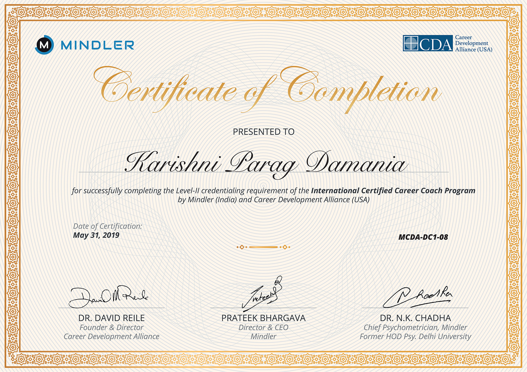 Certificate of Completion Level 1 for